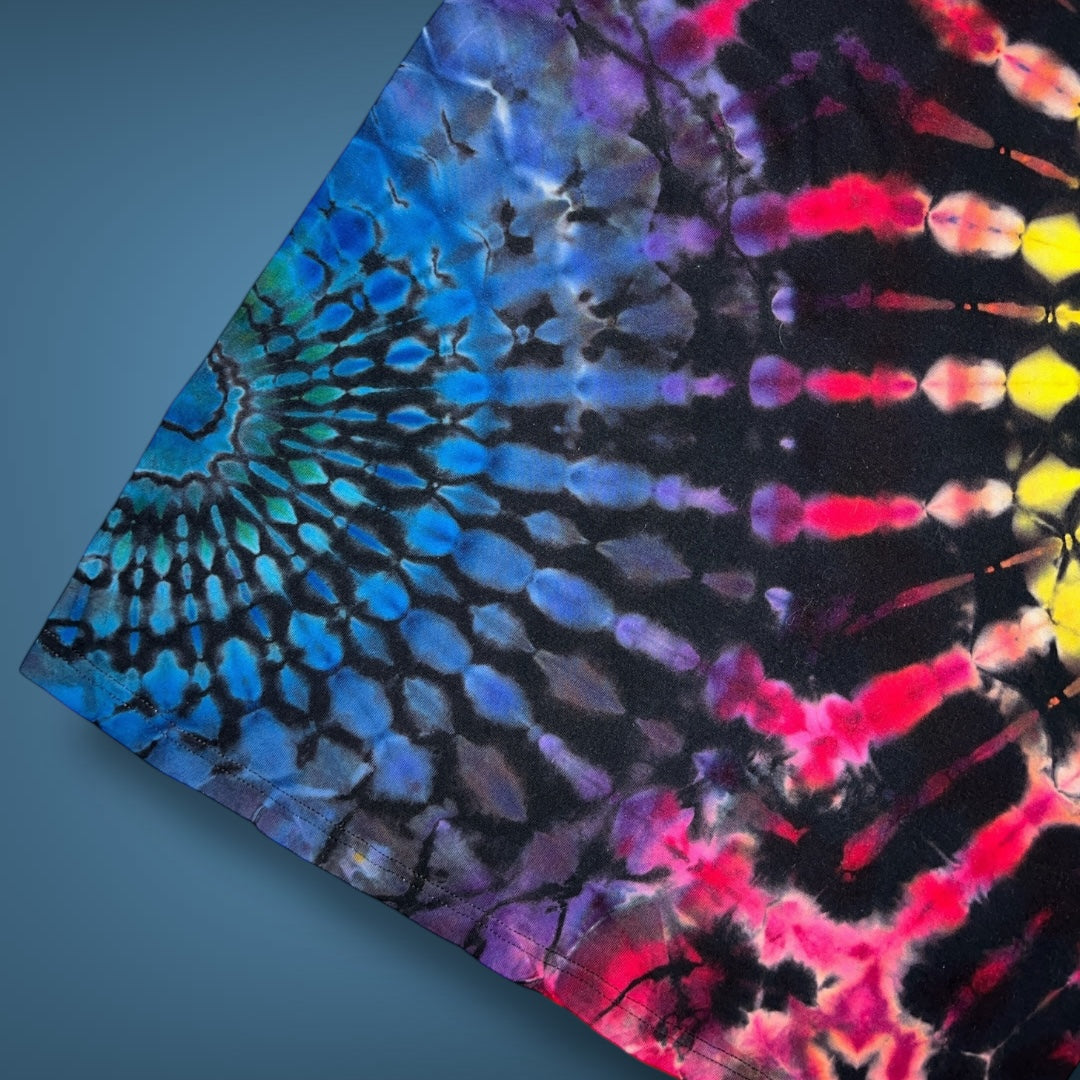 Colors used: #DharmaTradingCo hot hibiscus, bazooka pink, chili fuego, peach, bright yellow, lime pop, new emerald green, kingfisher blue, glacier blue, cerulean, grape, powerberry, gunmetal gray, #ProChemicalAndDye citrus yellow, lapis, and simply navy. I tied this in 3 15ยฐ fan folds and scrunched the middle section. Each fan fold was tied with a honeycomb tie. I used Out White Brite to reverse the shirt and let it soak in the hot, hot water for 15 minutes before washing/rinsing out the OWB. I washed this on a delicate cycle in a garment bag with synthrapol and then boiled it one last time in clean water to remove all the loose dye. This dried out completely before dyeing. I dyed this in two rounds in a rack. The first side was dyed dye-under-ice with all the rainbow colors I added in the photo below. I put a liberal sprinkle of soda ash over the ice. Once the ice melted, I finished the shirt with a hot water, soda ash, Glauberโs salt pariah method and washed out about 24 hours later.
