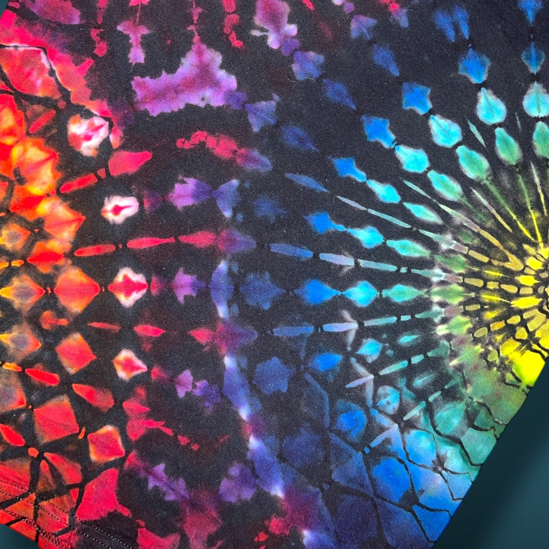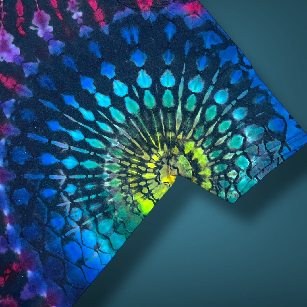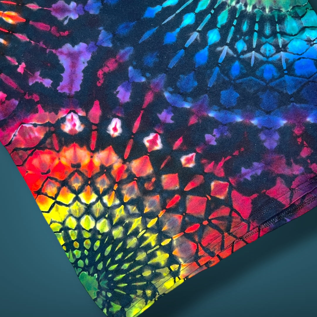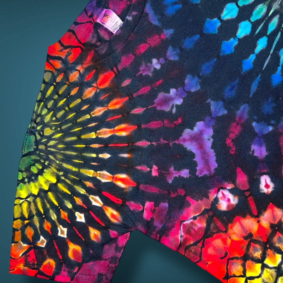 Embrace your unique style with our Stained Glass Reverse Dyed T-shirt! Featuring stunning detail and an ice-dyed reverse design, this KIDS Medium shirt is sure to turn heads. The precise folds and beautiful tessellations add a touch of artistic flair to any outfit.