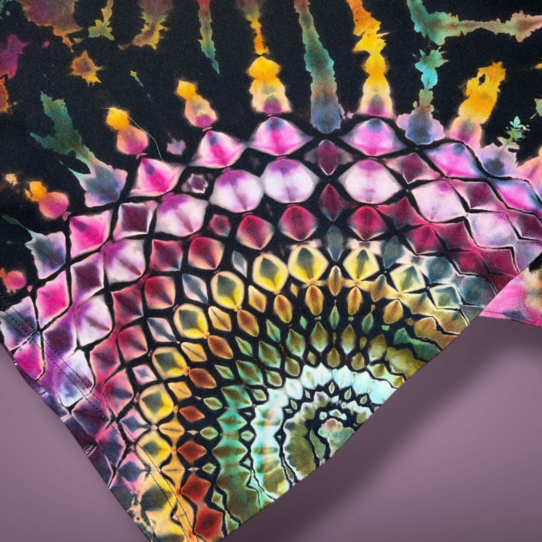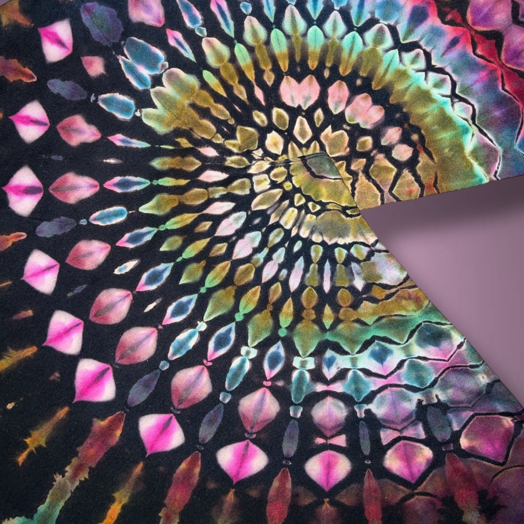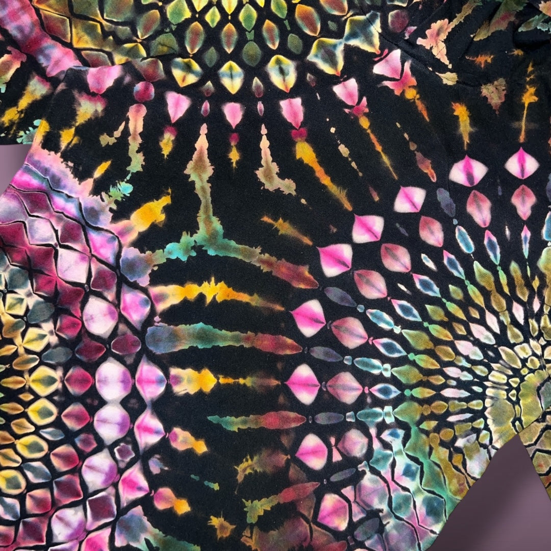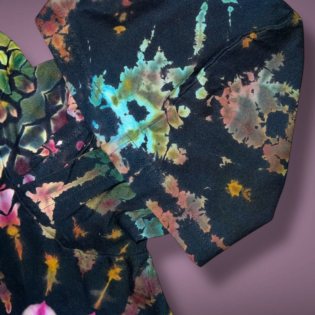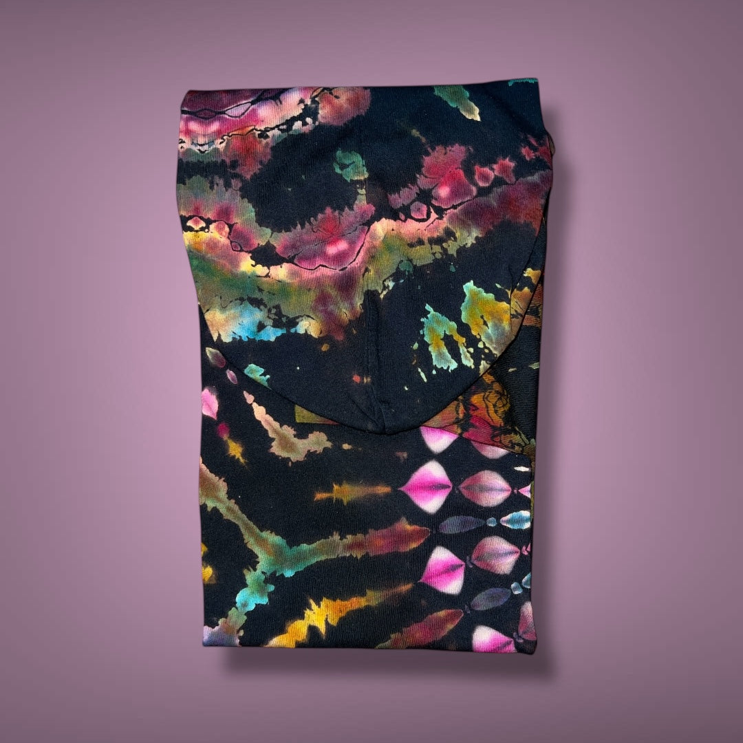 Process: I tied this in 3 - 15° fan folds and scrunched the middle section and hood. Each fan fold was tied with a honeycomb tie. I used OWB to reverse the shirt and let it soak in the hot, hot water for 10-15 minutes before washing/rinsing out the OWB. I washed this on a delicate cycle in a garment bag with synthrapol and then boiled it one last time in clean water to remove all the loose dye. This dried out completely before dyeing. I dyed this in two rounds in a rack. To dye, I did DUI with the colors described above for the first dye application and a sprinkle soda ash. After the first ice melt, I flipped it and applied the second dyes listed above DUI with a soda ash sprinkle. I finished the piece with a pariah method hot water, Glauber salt, and concentrated soda ash solution and let it batch for 48 more hours before washing out.