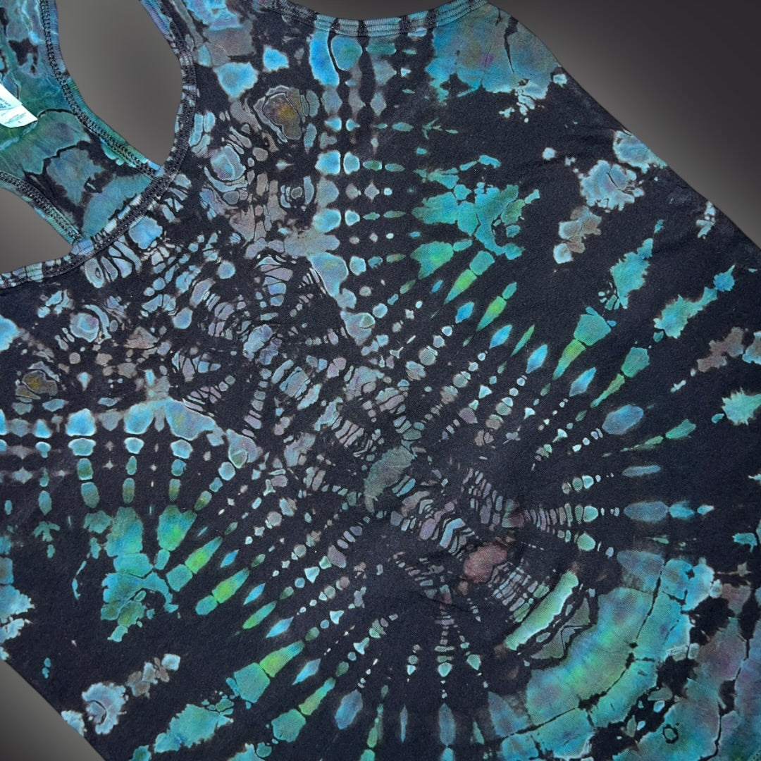 Get ready to turn heads in the Tribal Symmetry Tank! This women’s Large racerback is like looking into an ice cube - the blues and greens blend together for a bold statement. With a spine design on the back and a chest plate up front, you’ll rock those summer vibes like nobody's business! (P.S. Perfect for spontaneous dance parties!)